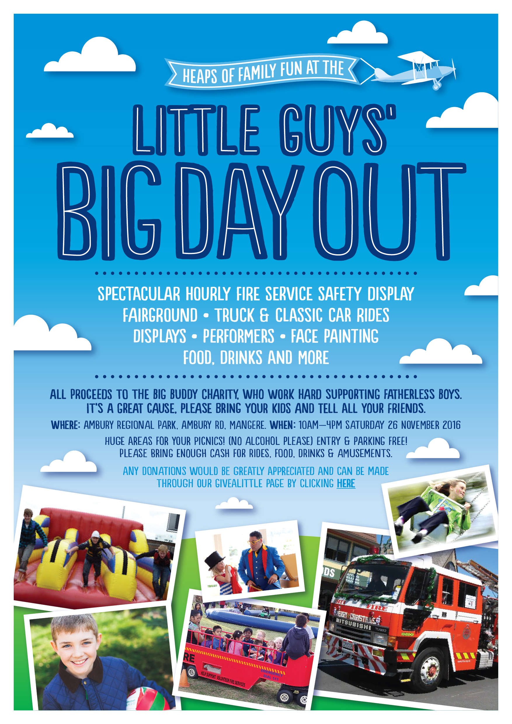 Last day before “Little Guys’ Big Day Out” in support fatherless boys, and now it’s all about publicity. It’s a free parking and entry family event at Ambury Regional Park, Ambury Road, Mangere, Auckland on Saturday 26 November, 10:00 a.m. till 04:00 p.m. Please donate to Big Buddy via Givealittle, or if you feel you want to get more involved, apply to be a Big Buddy.